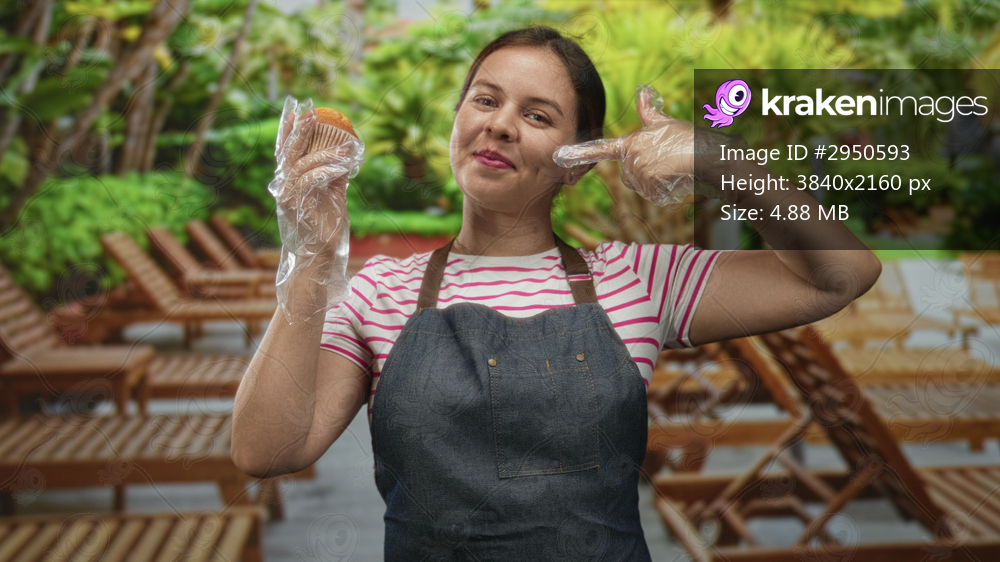 Woman wearing apron and plastic gloves holding muffin and pointing finger to cheek in forest; cheerful hospitality.
