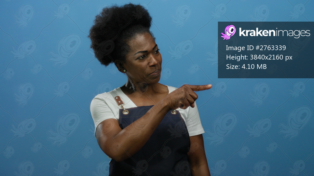 Woman wearing apron points confidently against blue background, embodying focus and direction in an isolated setting, indicating ideas with assertive gestures. - Kraken Images