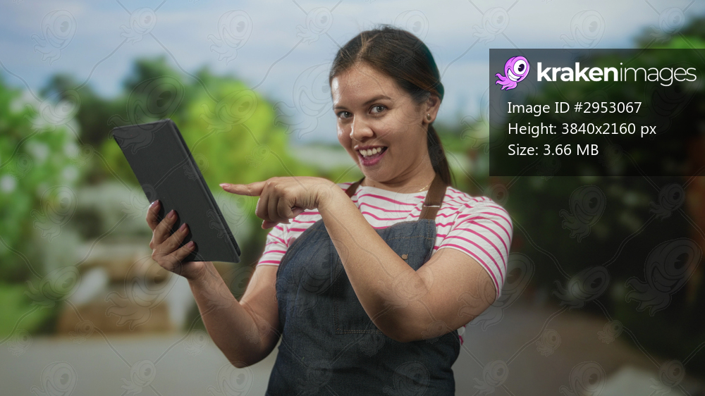 Woman wearing apron points finger to tablet in street garden while holding device and giving thumbs up; friendly approval.