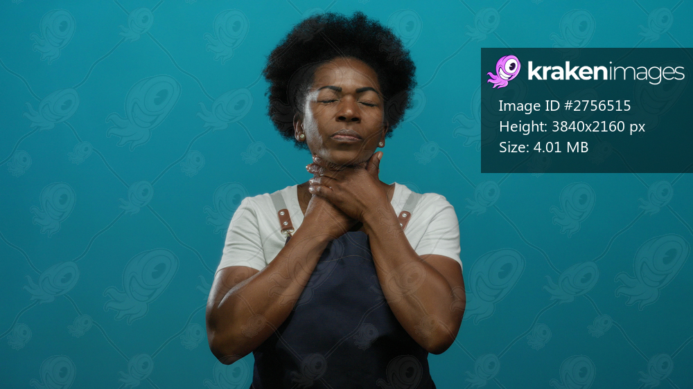 Woman wearing apron poses with eyes closed and hands on neck against isolated blue background suggesting calm or introspection.