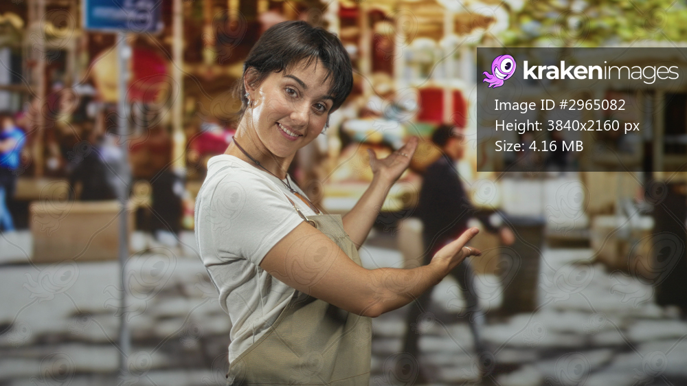 Woman wearing apron presenting with open palms on a busy street market scene; welcoming hospitality.