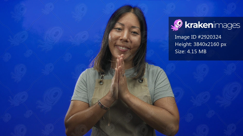 Woman wearing apron pressing hands together praying and smiling in studio blue backdrop; gratitude calm contentment.