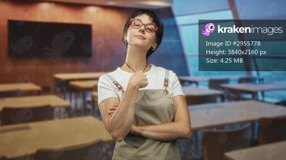 Woman wearing apron and red glasses, chin raised with hand near pendant and folded arms in a building classroom with tables and screen; skill craft independence pride. - Kraken Images