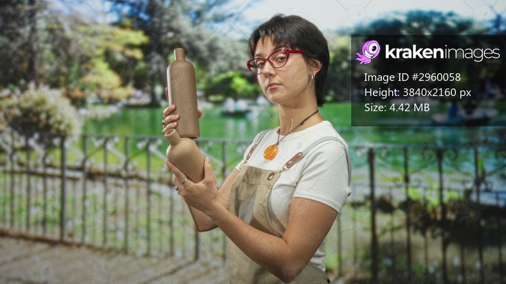 Woman wearing apron and red glasses holding and inspecting two clay bottles with hands by park railing and lake; contemplation.