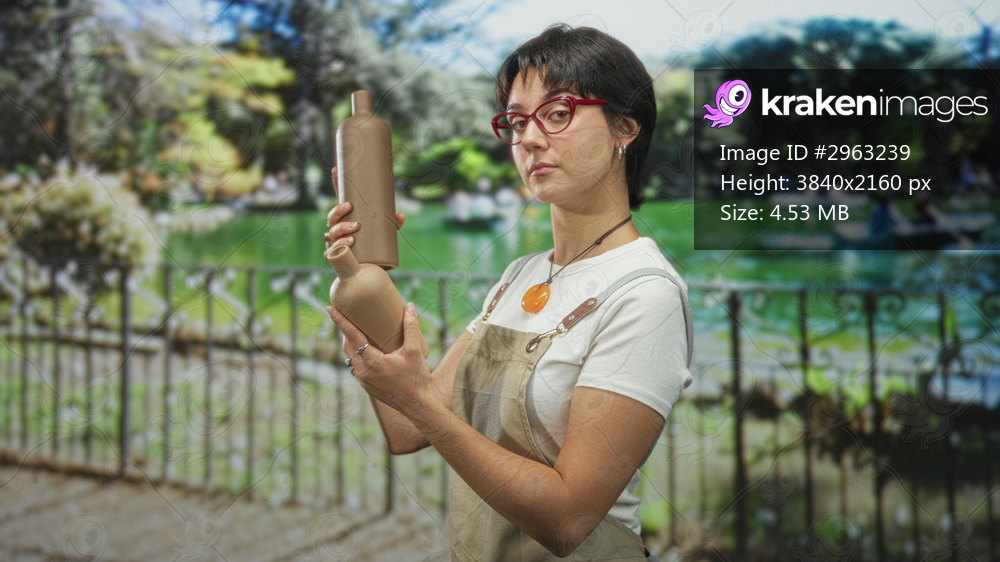Woman wearing apron and red glasses holding and inspecting two clay bottles with hands by park railing and lake; contemplation.