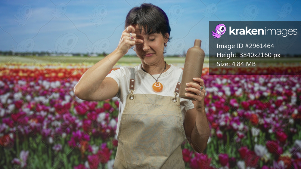 Woman wearing apron with short hair holding pottery bottle in right hand near chest and yawning in studio; tiredness craft pottery.