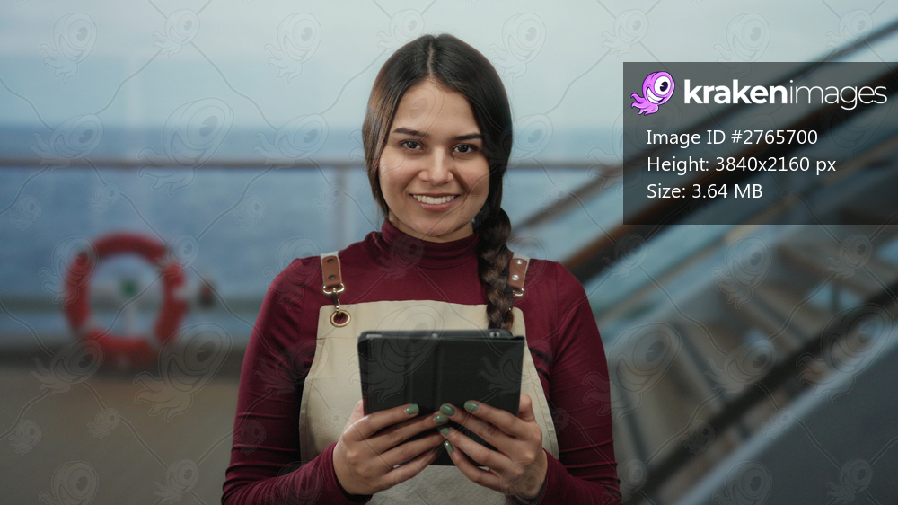 Woman wearing apron smiling on cruise ship deck by the sea, holding tablet with waves and lifebuoy visible, suggesting pleasant customer service experience at sea. - Kraken Images