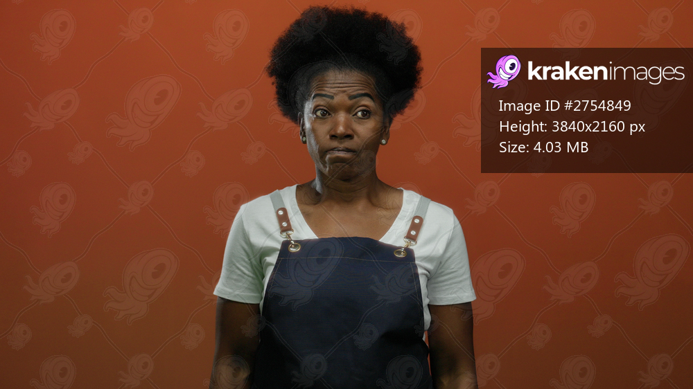 Woman wearing apron stands calmly against isolated red background with her eyes closed and serene expression, showcasing simple fashion against vibrant backdrop. - Kraken Images
