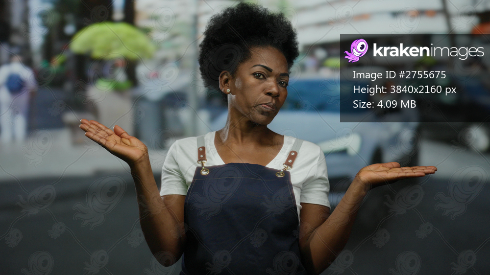 Woman wearing apron stands confidently on a bustling city street, conveying strength and modern urban lifestyle.