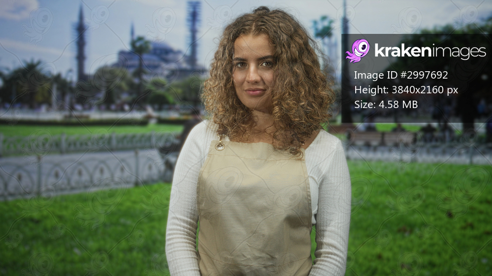 Woman wearing apron stands facing camera with slight smile, hands relaxed at sides, curly hair framing face, public park with historic building; serenity. - Kraken Images