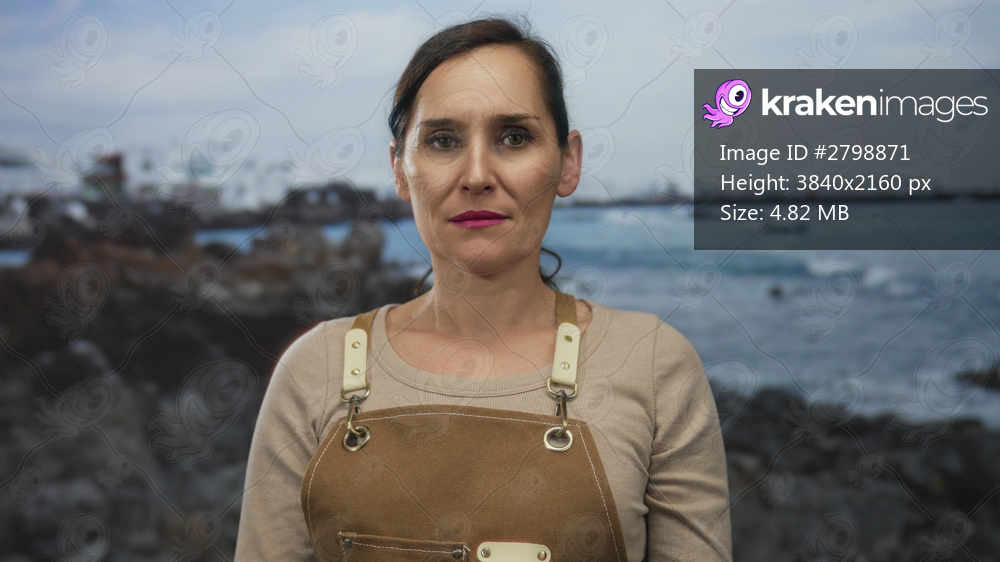 Woman wearing apron stands on a rocky seaside with an expression of various emotions, set against a vibrant ocean backdrop under a clear sky.