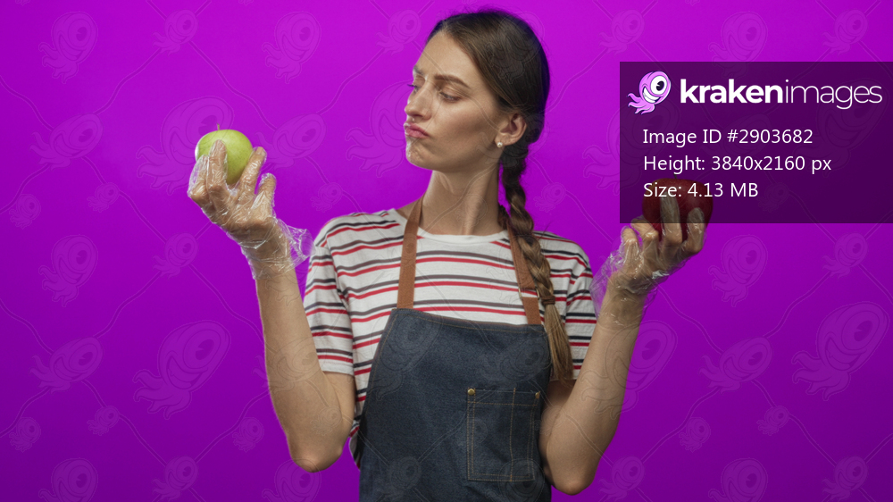 Woman wearing apron and striped shirt holding red and green apples with gloved hands in a purple studio; indecision choice healthy eating.