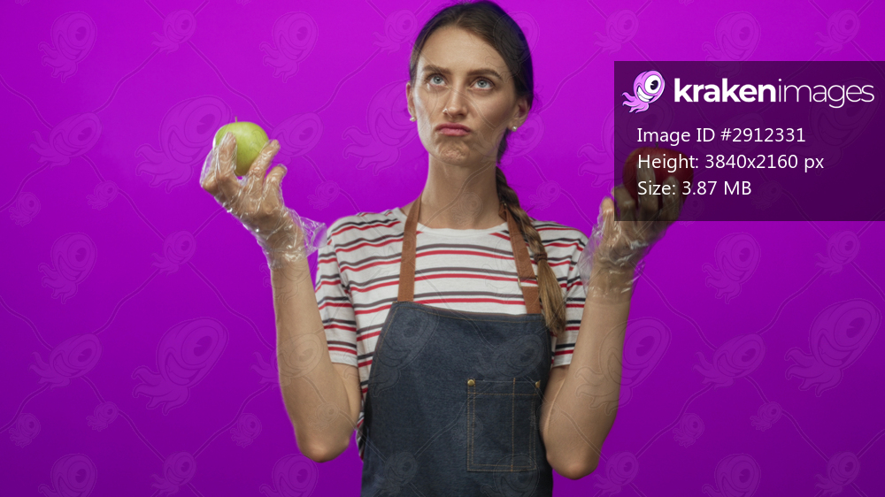 Woman wearing apron and striped shirt holding red and green apples with gloved hands in a purple studio; indecision choice healthy eating.