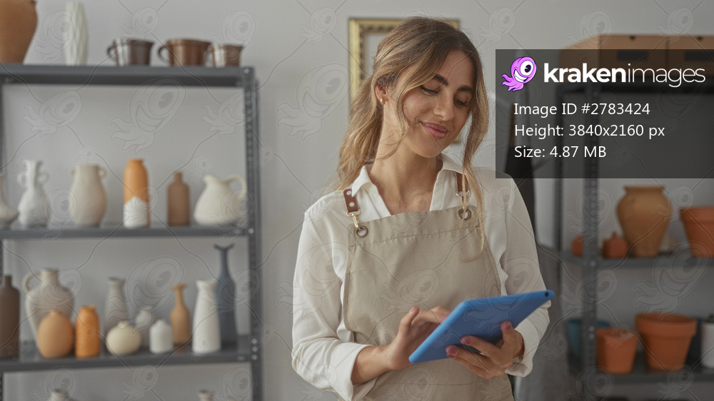 Woman wearing apron taps tablet with bare hands amid clay vases in pottery workshop; calm creativity focus.