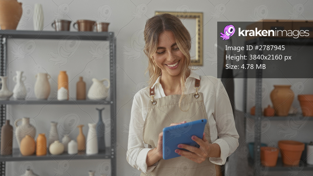 Woman wearing apron taps tablet with bare hands amid clay vases in pottery workshop; calm creativity focus.