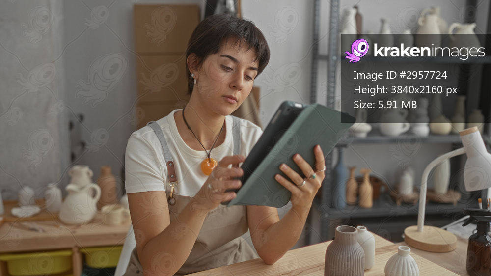 Woman wearing apron taps tablet screen with fingers while checking pottery on shelves in a studio; concentration craftsmanship.