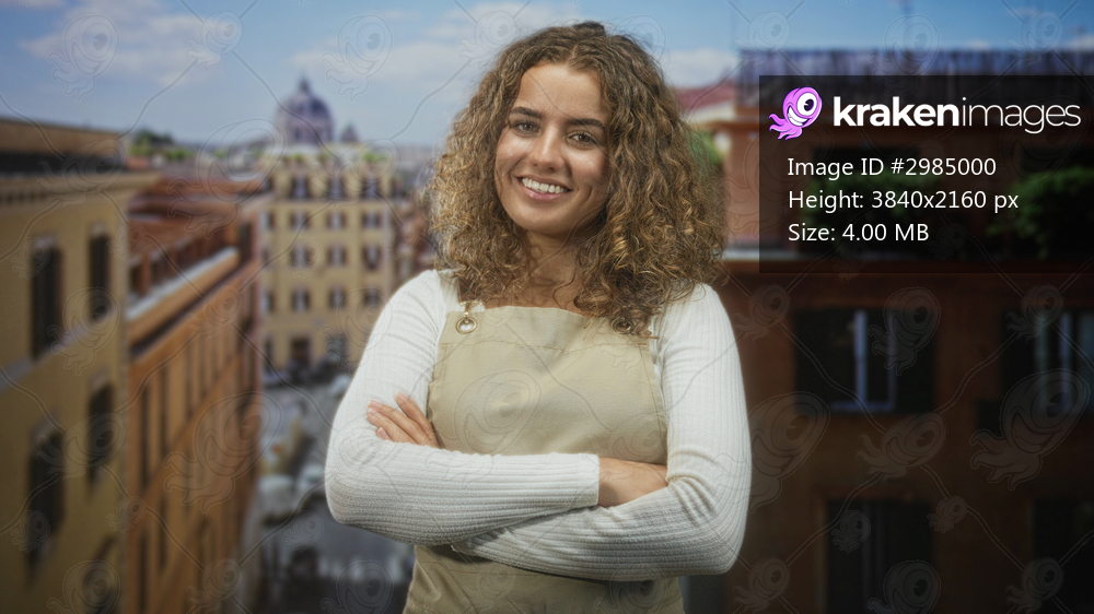Woman wearing apron and white sweater, arms crossed, smiling in front of a city building balcony with dome and windows visible; confidence.
