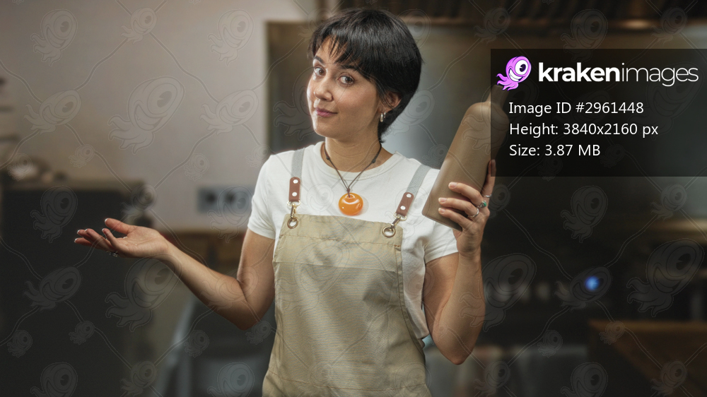 Woman wearing apron and white t shirt holding clay bottle with right hand, left palm up gesture, short hair, orange pendant visible in studio; curiosity craft. - Kraken Images