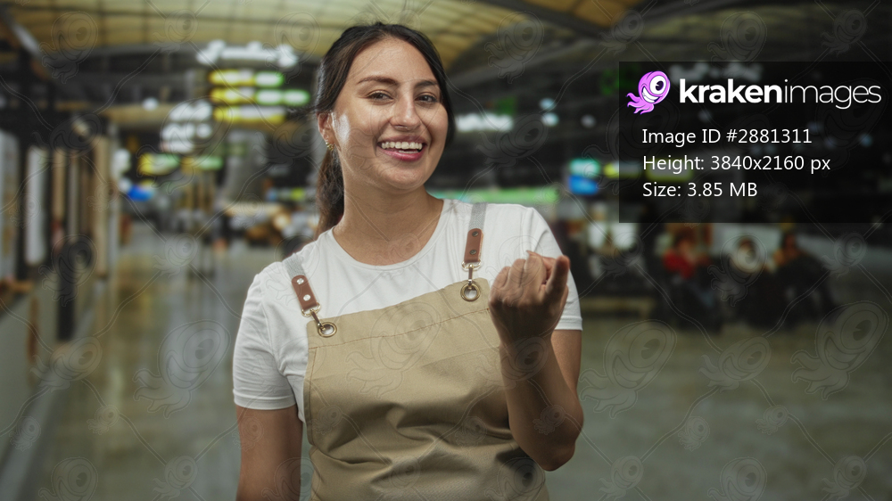 Woman wearing beige apron beckoning with hand in busy airport terminal near seating area and departure monitors; friendly welcome.