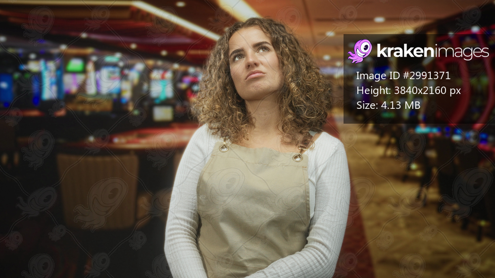 Woman wearing beige apron with closed eyes and subtle eye roll while clasping hands, posed before slot machines in a casino building; frustration loss. - Kraken Images