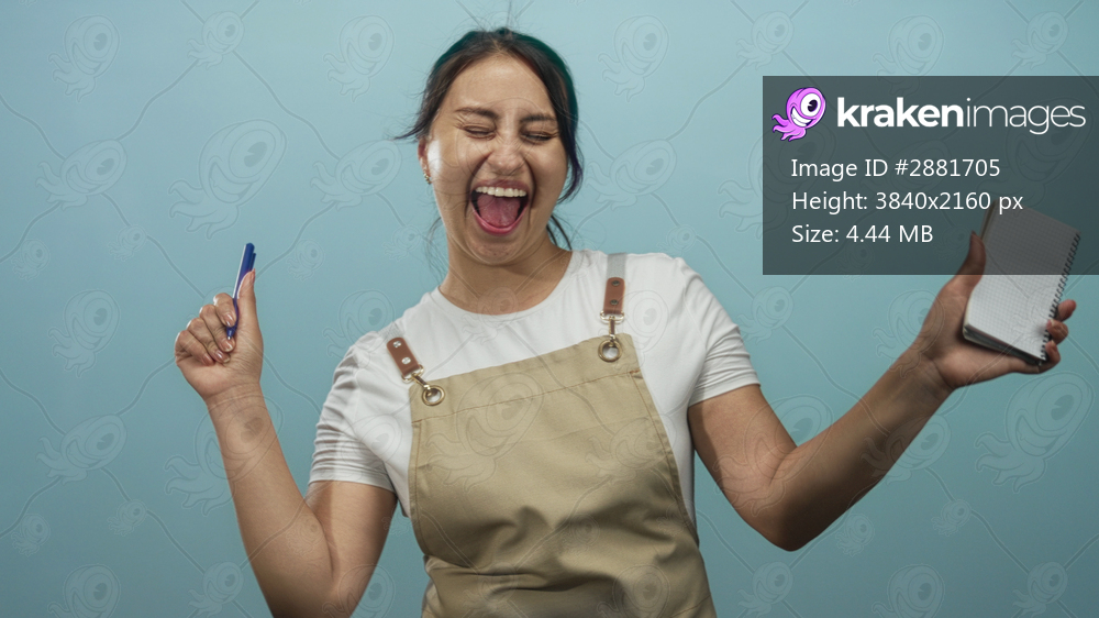 Woman wearing beige apron holding a pen and spiral notebook with raised arms and smiling in light blue studio; joy celebration.