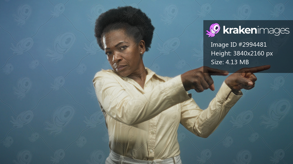 Woman wearing beige blouse points both index fingers outward while angled to camera in studio; confidence instruction.