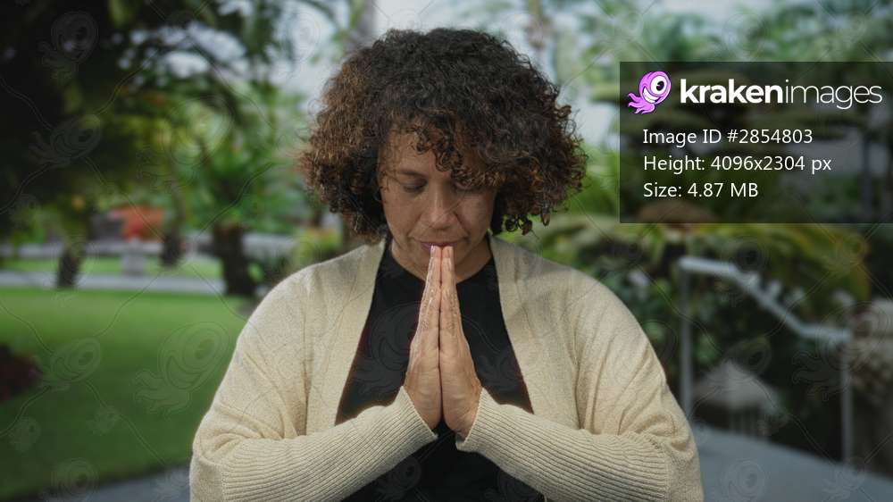 Woman wearing beige cardigan and black shirt with hands making ok gesture in green park amid trees; serenity.