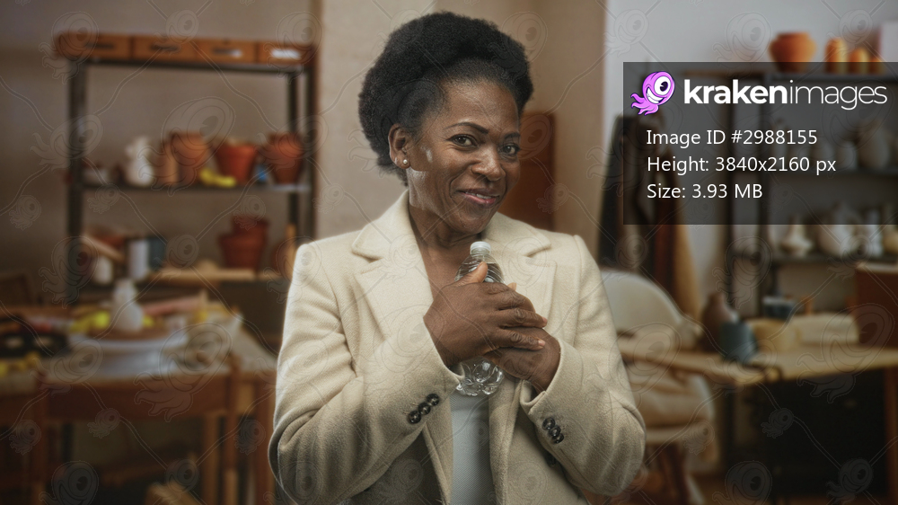 Woman wearing beige coat holding a water bottle to her chest with hands in a studio; contentment respite reflection.