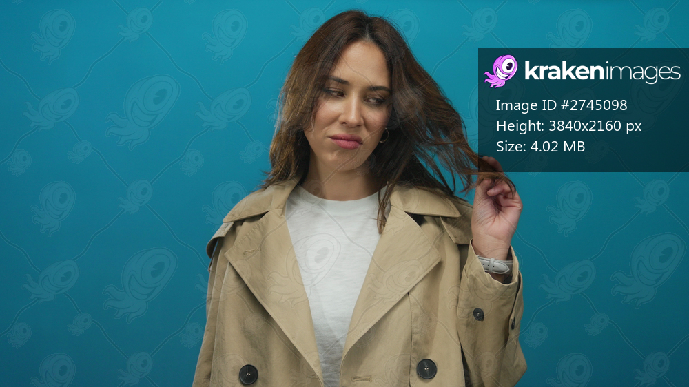 Woman wearing beige coat over isolated blue background playing with her hair, expressing curiosity and introspection with subtle gestures and a thoughtful expression. - Kraken Images