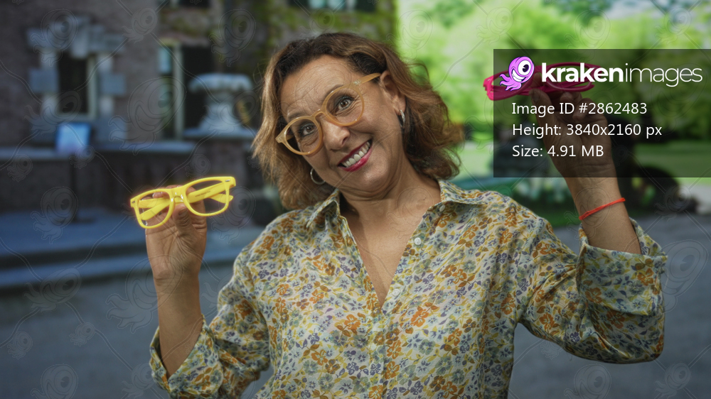 Woman wearing beige eyeglasses holds yellow and pink glasses frames on street showing smiling face; happiness.