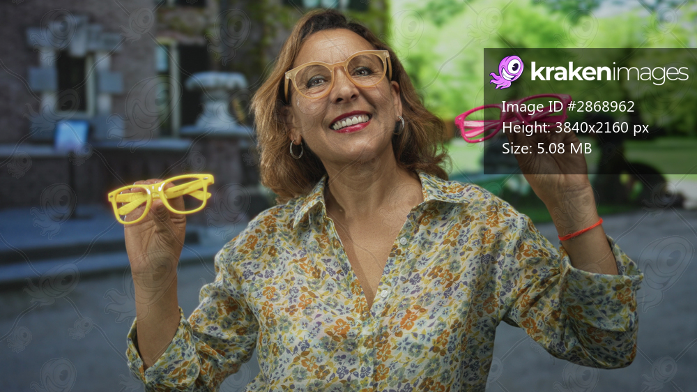 Woman wearing beige eyeglasses holds yellow and pink glasses frames on street showing smiling face; happiness.