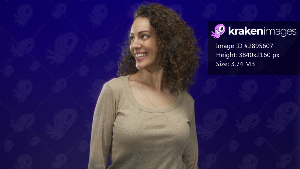 Woman wearing beige long sleeve top smiling and giving thumbs up while looking sideways in studio against deep blue backdrop; confidence encouragement. - Kraken Images