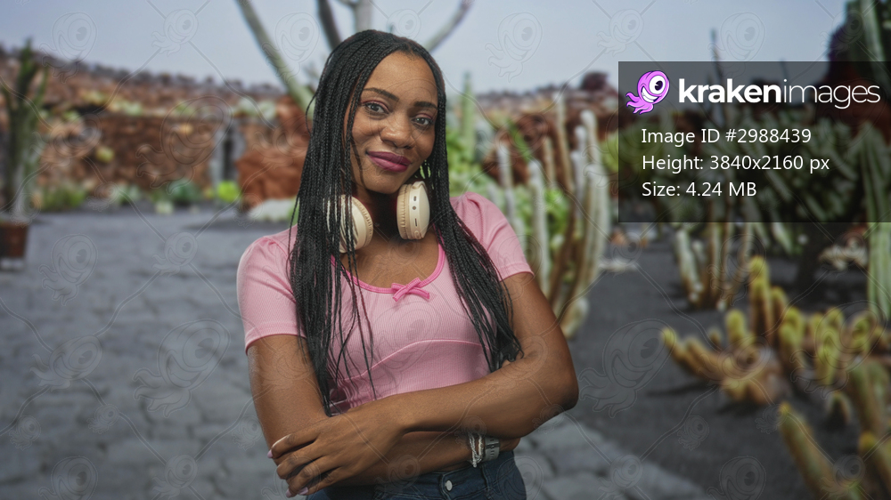 Woman wearing beige over ear headphones around neck and arms crossed, standing on a paved street lined with cacti and lava rock formations, casual pink crop top visible; confidence daydream. - Kraken Images