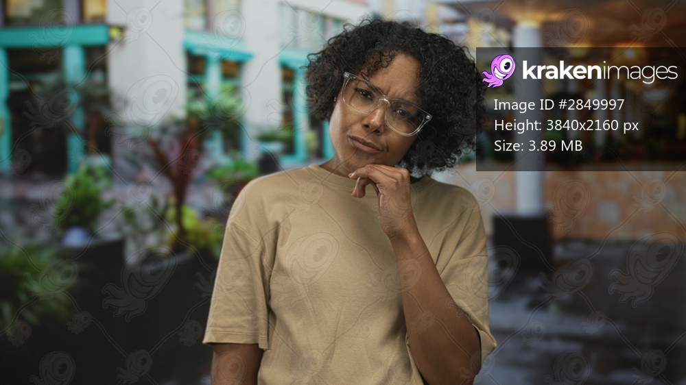 Woman wearing beige shirt and glasses touches her chin with one hand on a busy urban street during daytime; self reflection doubt.
