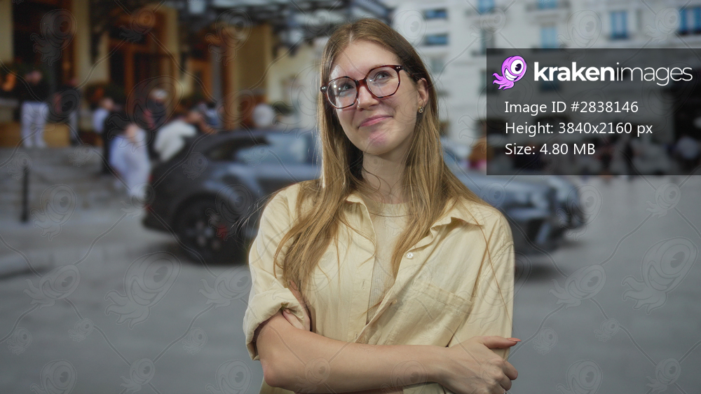 Woman wearing beige shirt holding finger to lips for silence in street; hush secret mystery intrigue.