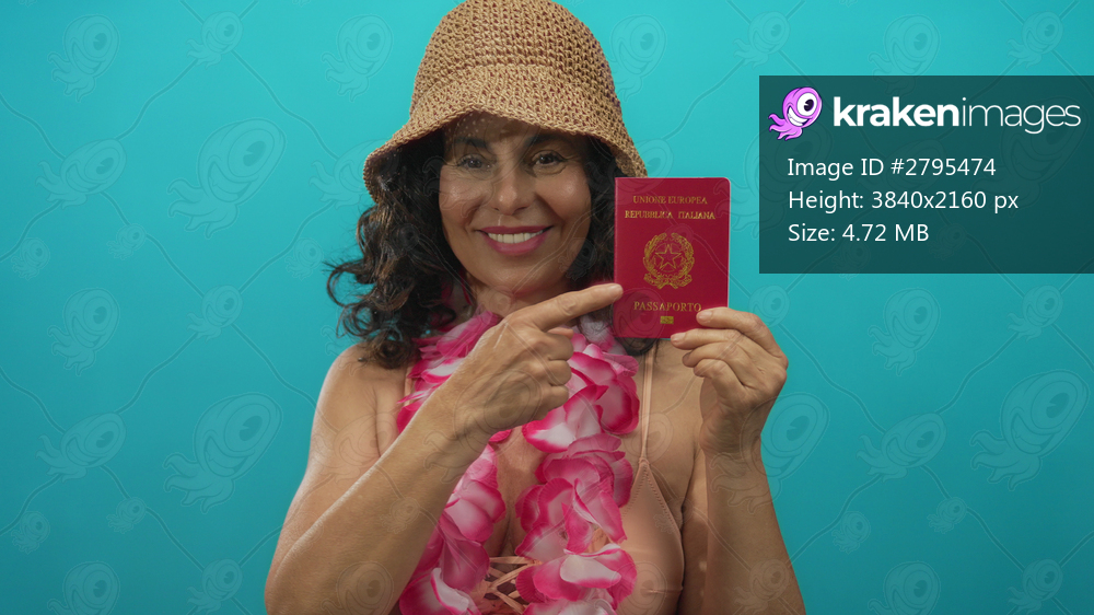 Woman wearing bikini and hawaiian lei holds italian passport against green background, showcasing travel theme with middle-aged hispanic appearance and summer vibe. - Kraken Images