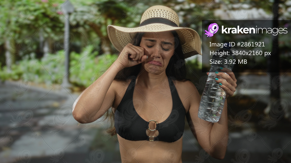 Woman wearing black bikini top and straw hat wipes tears with fist and holds water bottle in forest; sadness.