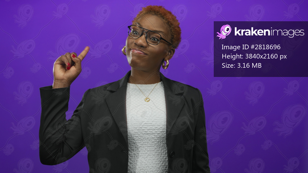 Woman wearing black blazer and glasses pointing finger toward blank space in purple studio; confidence.