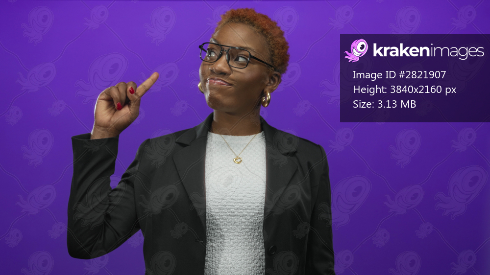 Woman wearing black blazer and glasses pointing finger toward blank space in purple studio; confidence.