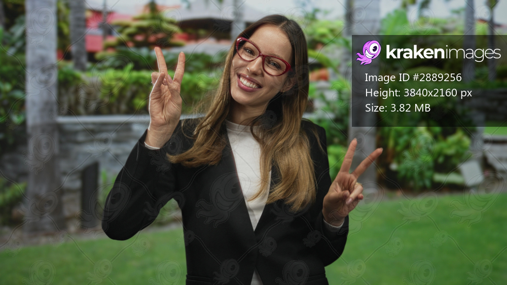 Woman wearing black blazer and red glasses making peace sign with both hands in park near stone building and green lawn, smiling broadly; joy confidence. - Kraken Images