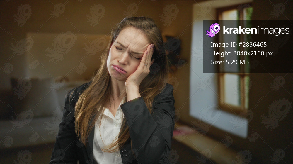 Woman wearing black blazer and white blouse sitting and pressing forehead with hand in living room; discomfort.