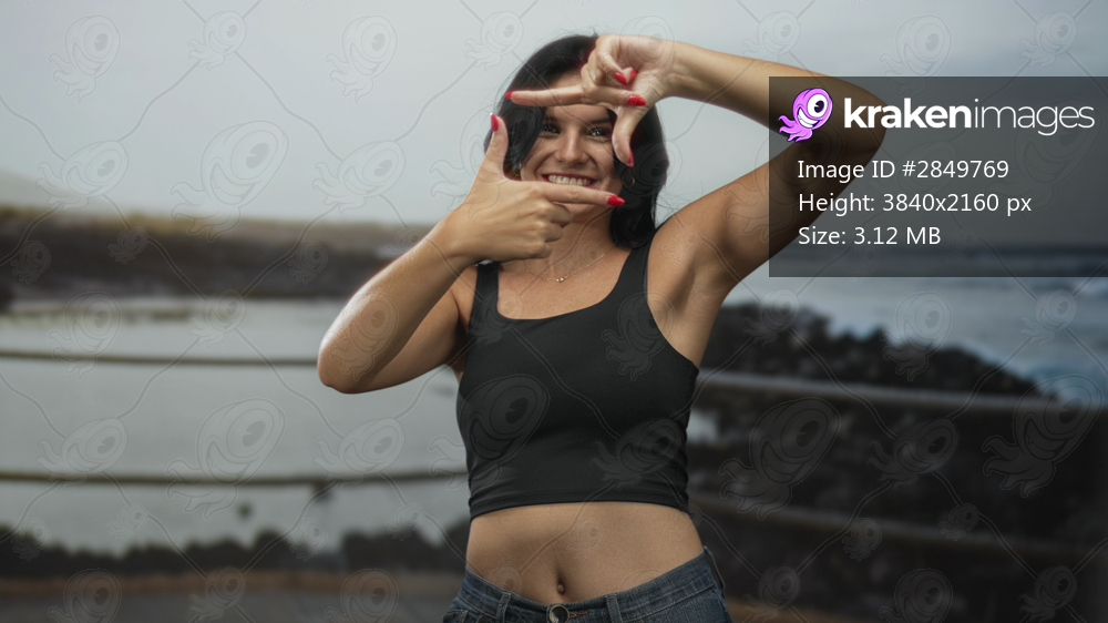 Woman wearing black crop top framing her face with hands on street near ocean railing; creative vision.
