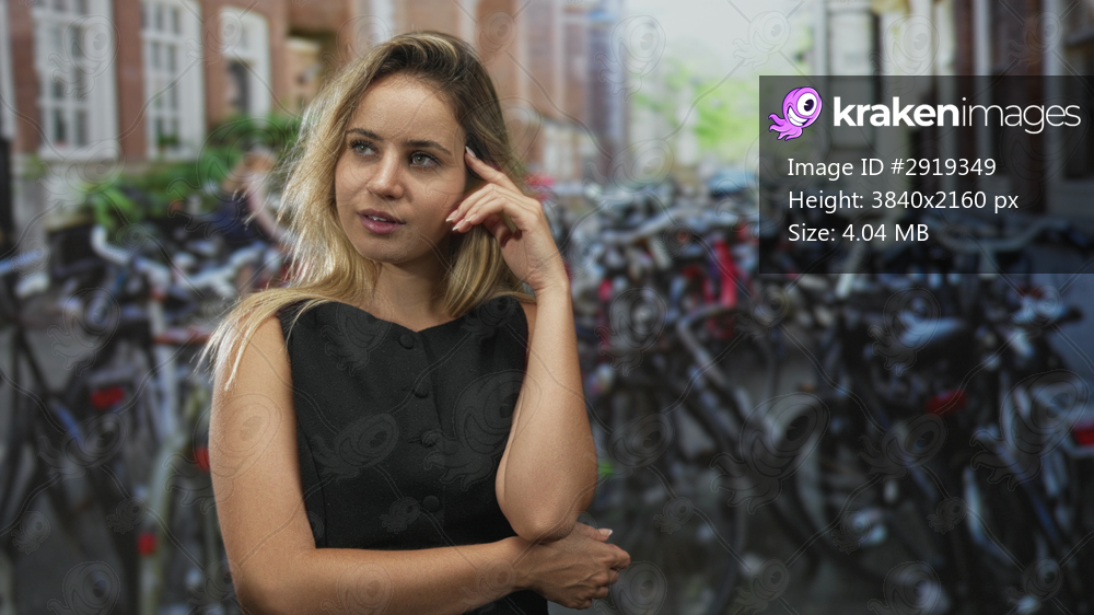 Woman wearing black dress with hand to forehead and arm folded across body on street in amsterdam; contemplative reflection.