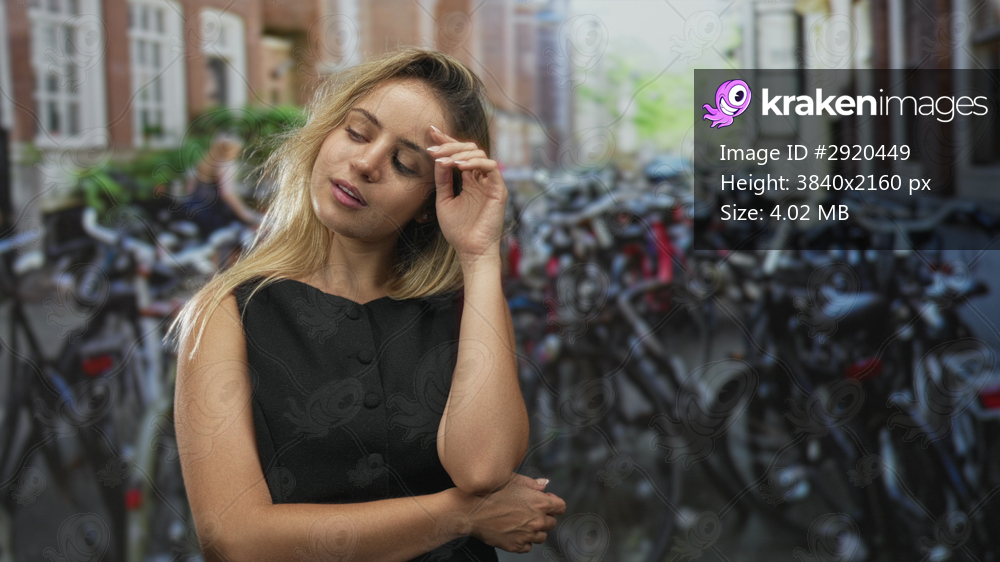 Woman wearing black dress with hand to forehead and arm folded across body on street in amsterdam; contemplative reflection.