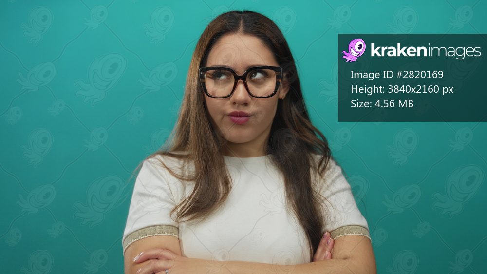 Woman wearing black framed glasses and white shirt with crossed arms in a teal studio space; denial seriousness.