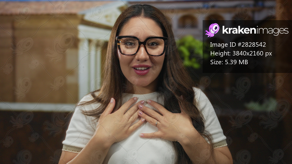 Woman wearing black glasses touches mouth with manicured hand on old town street in daylight; surprise reaction.
