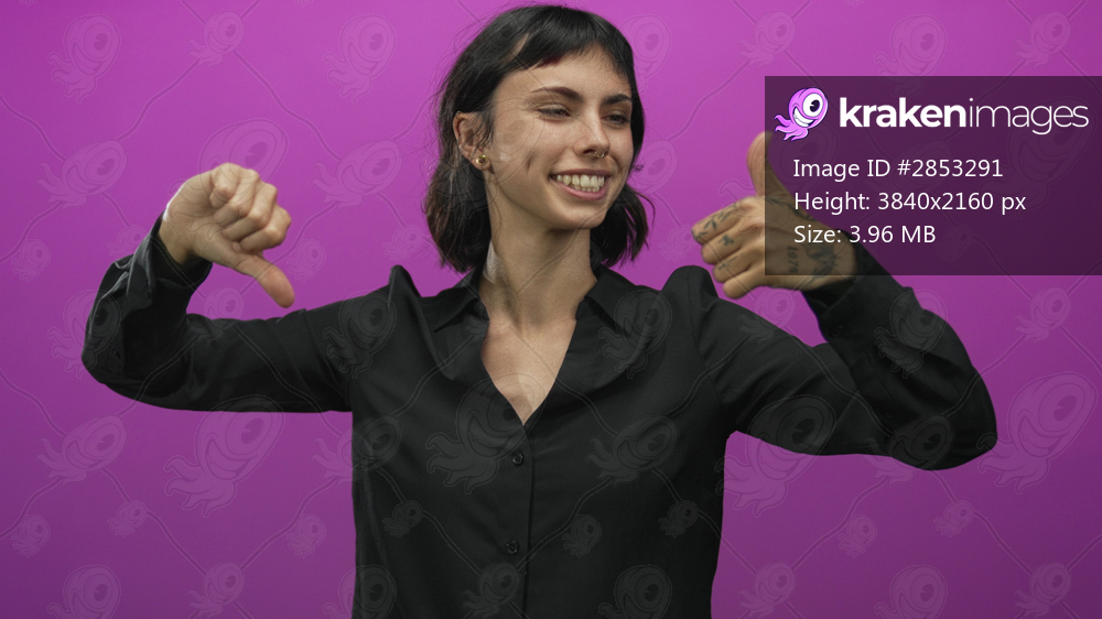 Woman wearing black shirt holds thumbs up and thumbs down gesture in purple studio; indecision dilemma.