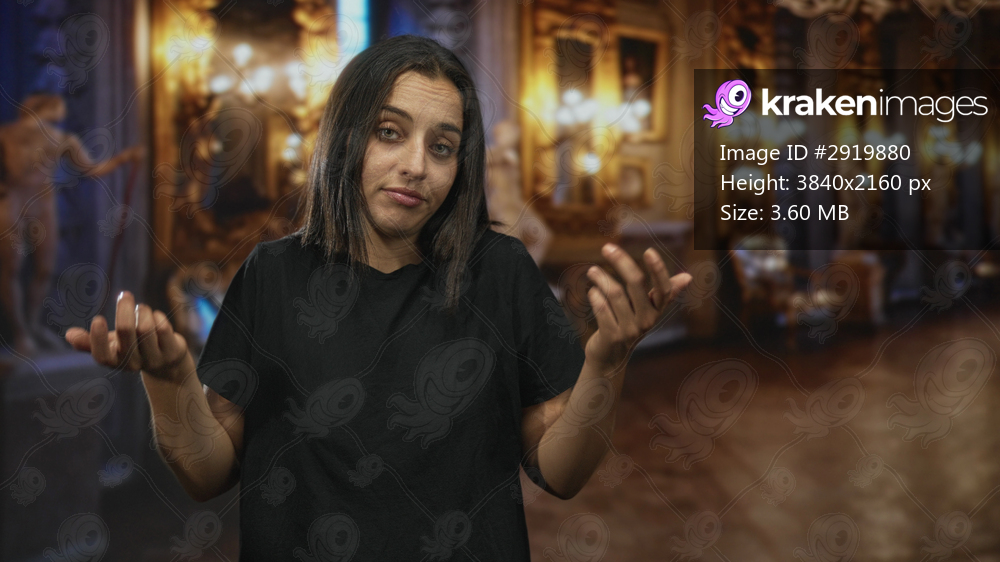 Woman wearing black t shirt shrugging with hand on chin and arms out in ornate museum gallery; skepticism contemplation.