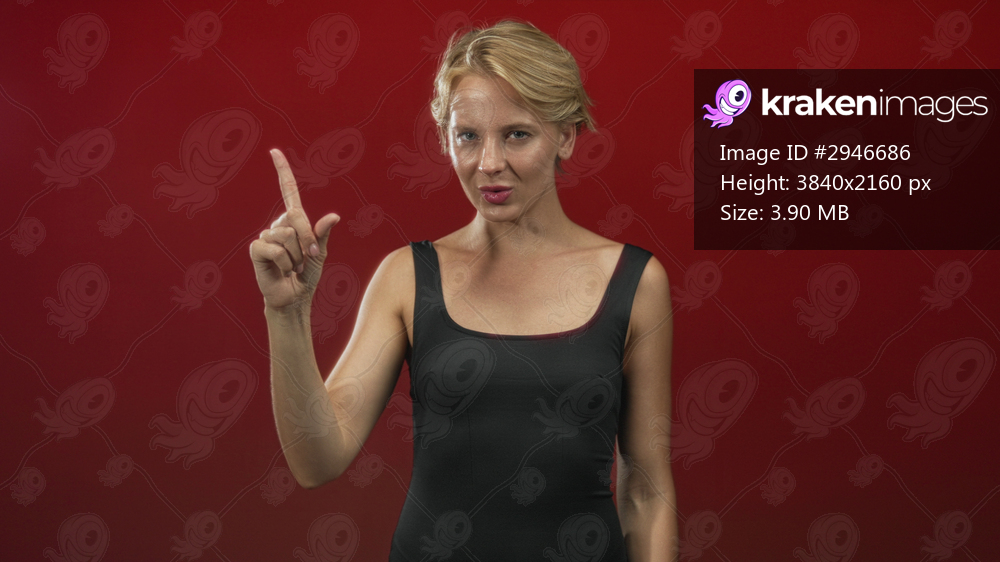 Woman wearing black tank top points index finger toward camera in studio with red backdrop; confidence instruction.