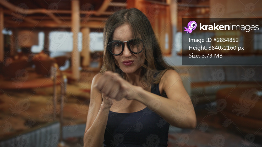 Woman wearing black tank top and round glasses lifts clenched fists near chin inside hotel building lounge area; determination empowerment.